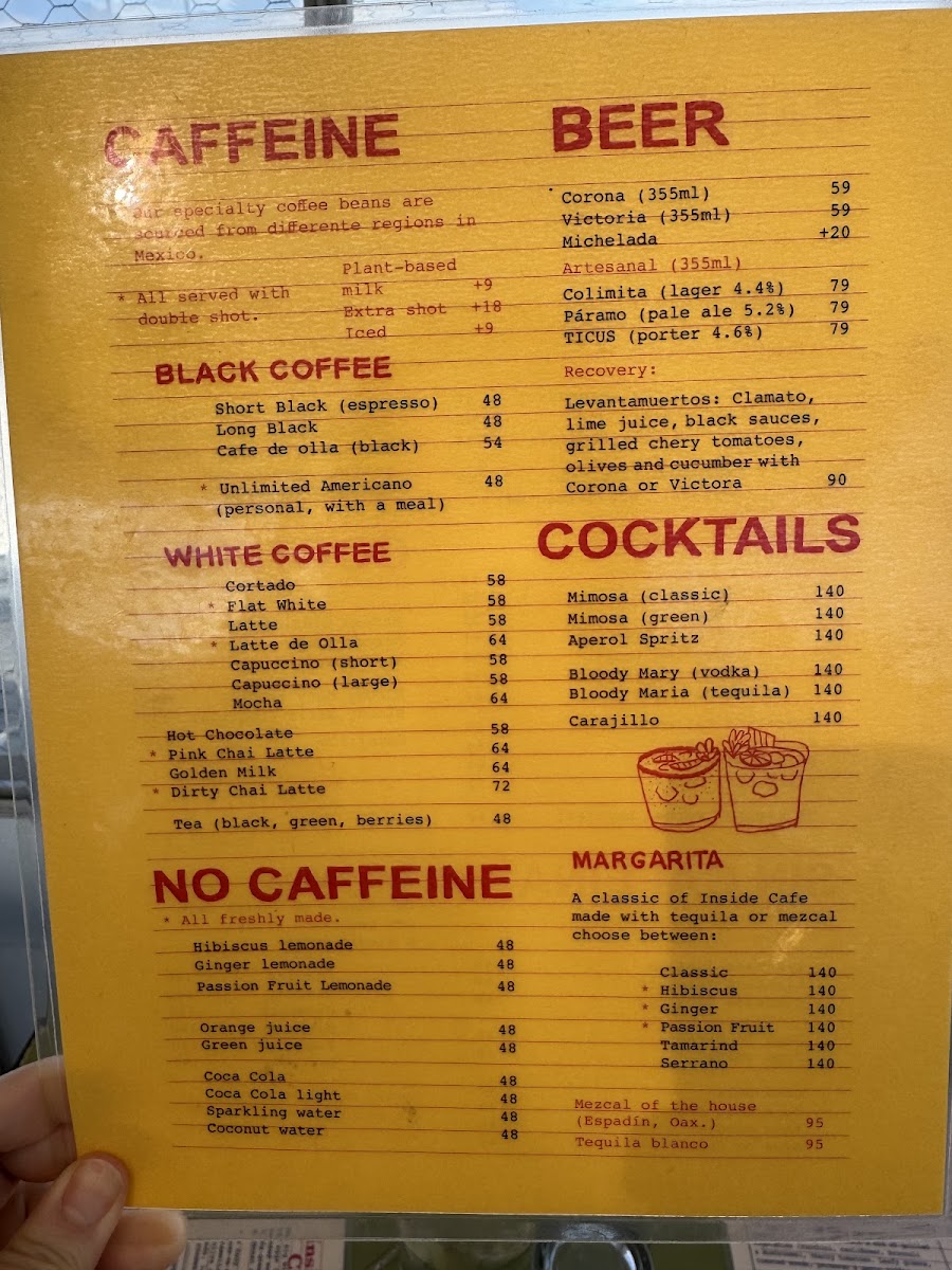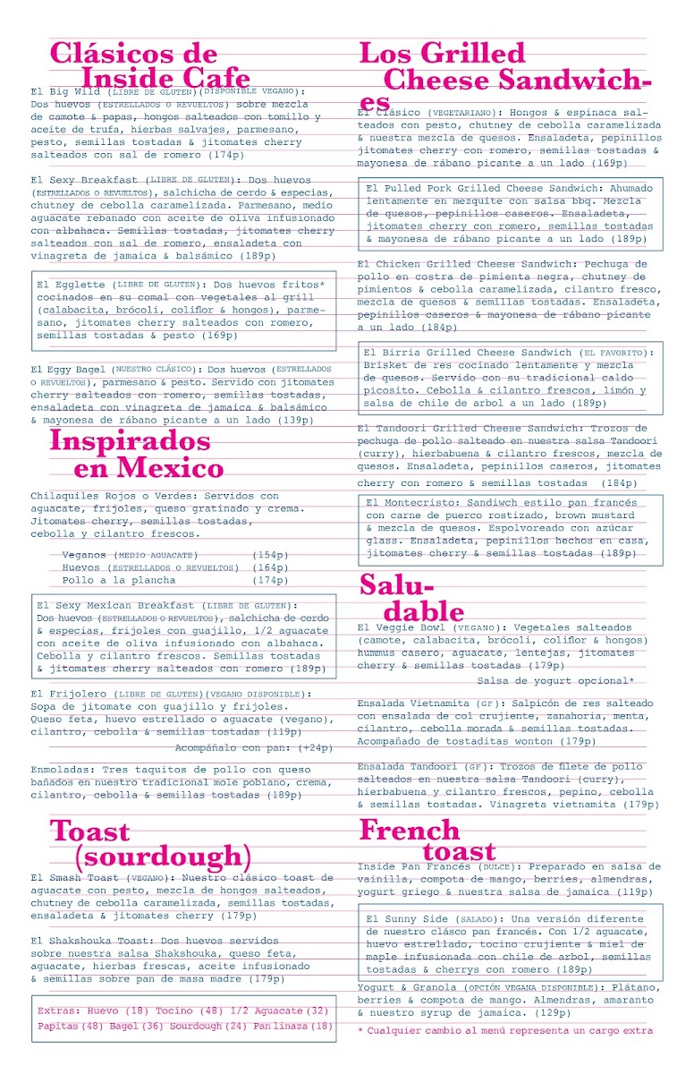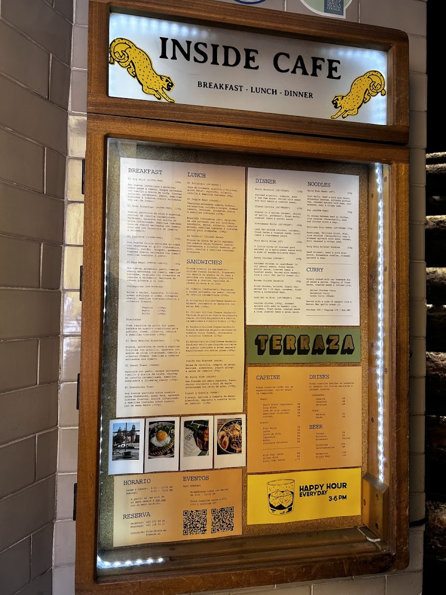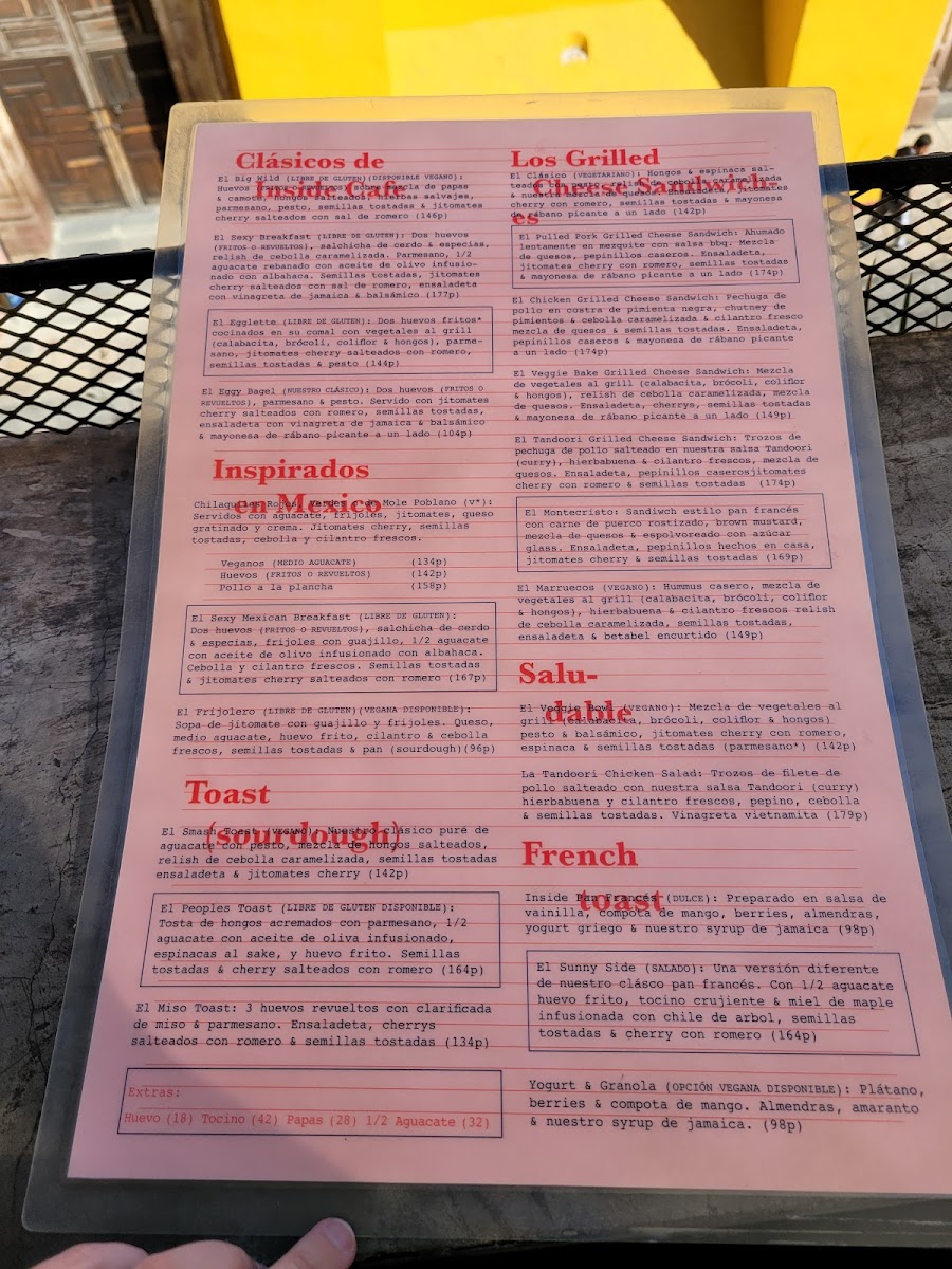 The Inside Cafe Menu offers a delightful array of dishes that make every visit a memorable experience. Nestled in the heart of San Miguel de Allende, just off Insurgentes 66, this cozy spot in the Zona Centro invites you to enjoy flavors that feel like a warm embrace. Whether you're craving a quick bite or a leisurely meal, the menu has something for everyone, from savory classics to innovative creations. The rich aromas of freshly brewed coffee complement the comforting meals, making it the perfect place to unwind or catch up with friends. Don't miss out on their signature dishes, each prepared with a special touch that reflects the vibrant culinary scene of the Centro Histórico. If you're looking for a place that feels like home, Inside Cafe is the spot where good food and good company come together.